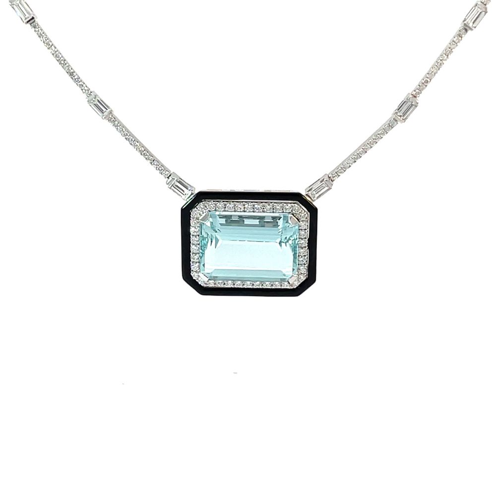 This breathtaking pendant showcases a mesmerizing 10.26ct octagon-cut aquamarine, celebrated for its crystalline clarity and cool blue tones. The striking center stone is embraced by a dazzling white diamonds totaling 4.72 ct, expertly set to maximize brilliance and contrast. Suspended gracefully from a fine white gold chain, also adorned with white diamonds