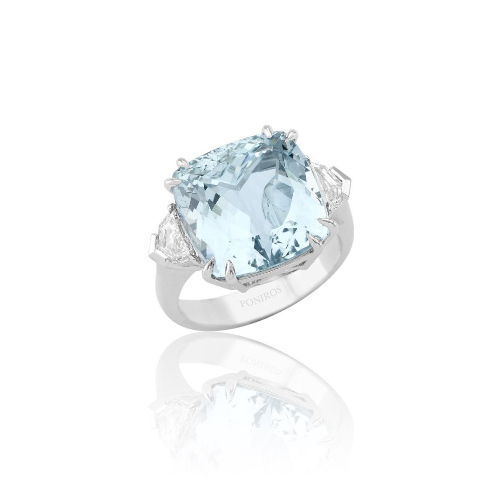 A statement of elegance, this luxurious ring features a stunning 11.07 carat cushion-cut aquamarine, radiating serene ocean-blue hues with exceptional clarity and brilliance. Framed by two delicate white diamonds totaling 0.63 carats, each stone is meticulously set to enhance the central gem’s luminous glow.