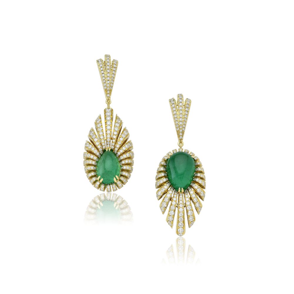 These exceptional gold earrings feature vivid emerald centerstones 8,03ct, celebrated for their deep green hue and timeless allure. Set in a unique recto verso design, with rays of white diamonds totaling 2.32ct.
