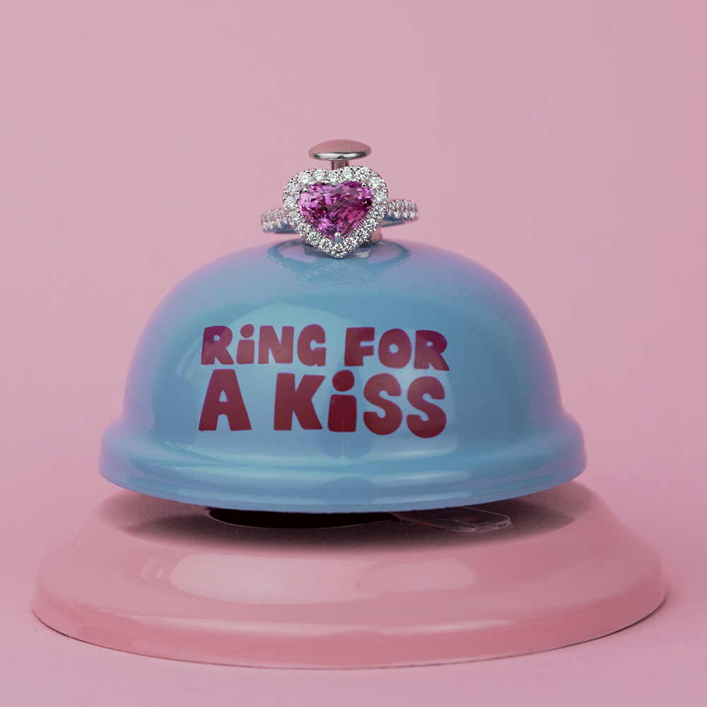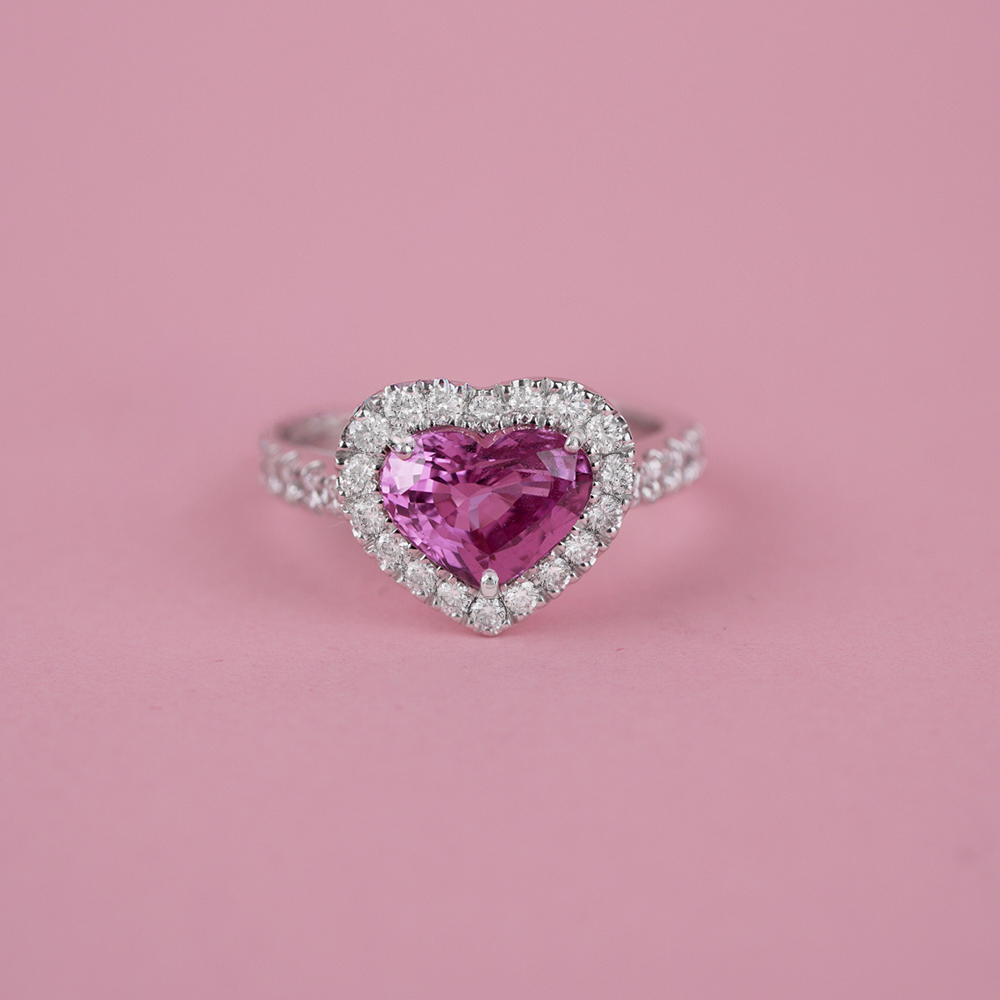 A 3,25ct heart-shaped pink sapphire ring in 18kt white gold, set with 0,95ct white brilliant cut diamonds — a timeless expression of love and elegance, perfect for Valentine’s Day.