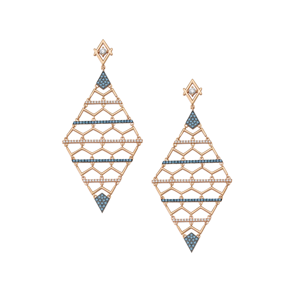 The poetic symmetry of geometric lines and architectural forms is brought to life with a delicate yet powerful feminine aesthetic. The Peristeriones Collection (Dovecotes) is a sophisticated mantra of finely tuned patterns in 18 carat gold with diamonds in a graceful yet thrilling array of rings, pendants and hanging earrings.