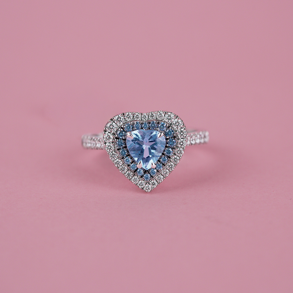 A heart-shaped jewel in radiant 18kt white gold, set with 0,41ct white and 1,15 blue brilliand diamonds and 0.67ct Aquamarine — a timeless expression of love and elegance, perfect for Valentine’s Day.